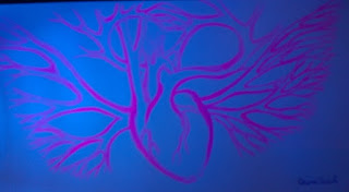 Aceasta pictura in acrilice pe panza pe care am facut-o ieri are a subiect povestea unui om indragostit , ce se intampla in creierului lui, cum se aprinde nucleul INAH 3 din hipotalamus, structura dimorfica sexual care se diferentiaza sexual (poate fi masculinizata de actiunea hormonilor androgeni care activeaza gena Xq28 sau poate ramane in starea feminina, de baza in natura, in absenta androgenizarii sau in cazul mutatiilor genei Xq28) in perioada prenatala si asa cum s-a format atunci, asa ramane toata viata. Nucleul INAH 3 este sediul cerebral al preferintelor sexuale . Este o poveste care incepe cu dezvoltarea creierului, de la gene si factorii care survin in perioada prenatalasi se termina cu un om adult care se indragosteste de persoana de care a fost programat genetic sa se indragosteasca, in functie de structura creierului, mai ales a nucleului INAH 3